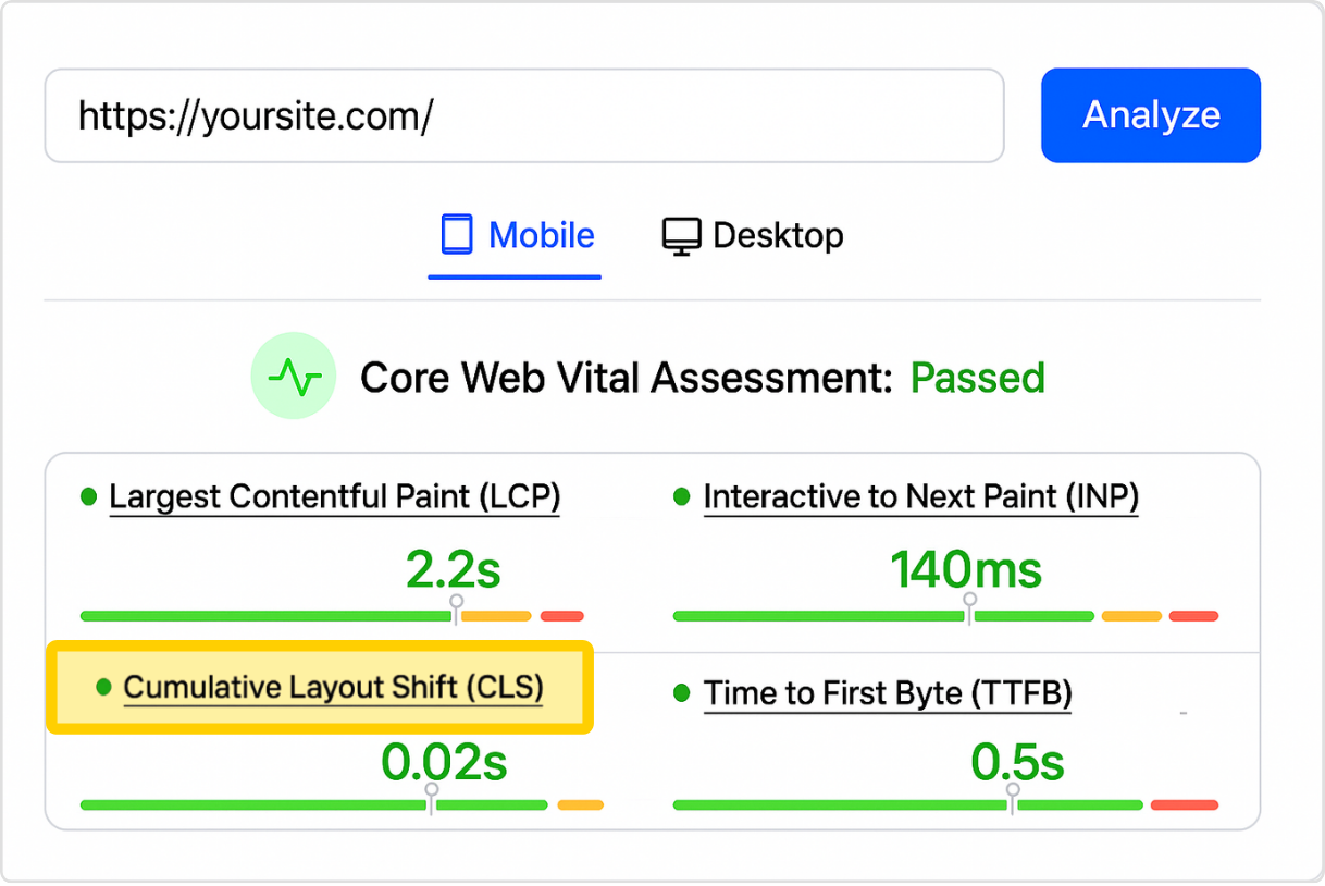 We address the underlying causes of poor performance, like unoptimized images, render-blocking JavaScript, poor server response times (TTFB), and layout instability. Every optimization targets specific Core Web Vitals metrics with measurable results.